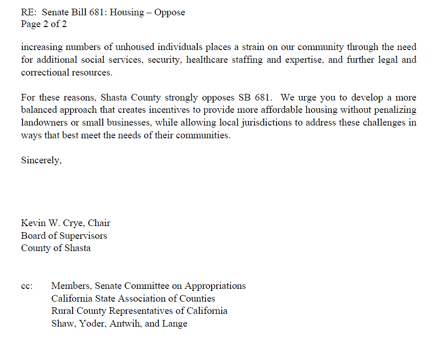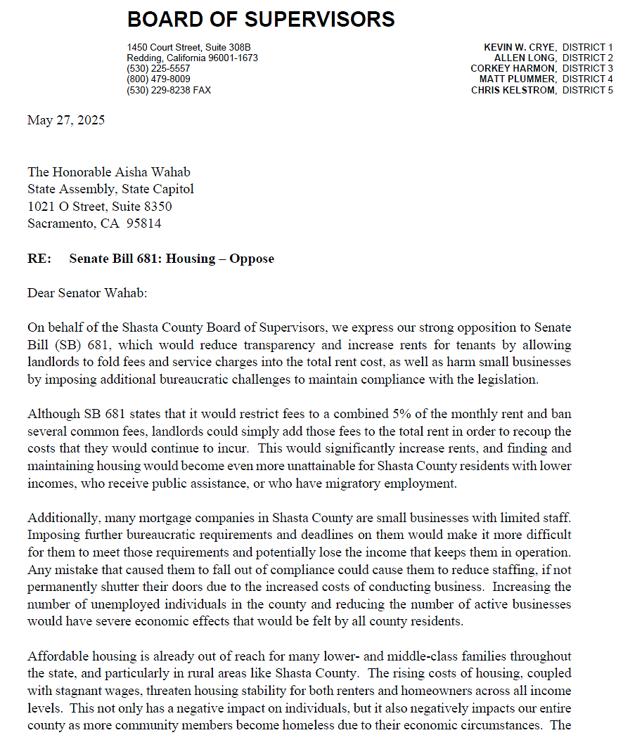 - Opposition to SB 681, a housing regulation bill. SB 681 aims to increase fee transparency in rental housing by restricting landlords from charging separate, itemized fees for services like air conditioning, wastewater, and trash. Instead, it encourages landlords to bundle these costs into the rent to avoid misleading advertising or “hidden” charges after a tenant moves in.