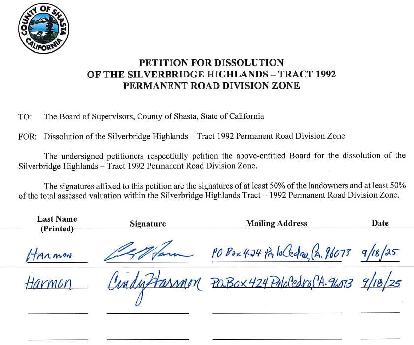 - End the two Permanent Road Divisions (PRDs) that were set up to fund road maintenance for the subdivision; and