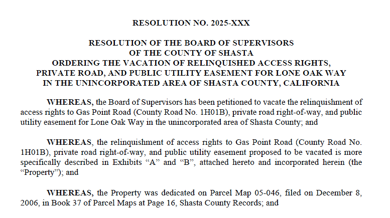 Public Works is asking the Board to formally abandon an unused public utility and road-access easement in the Lone Oak Way/Gas Point Road area of Cottonwood. The County noticed the hearing and checked with affected agencies; the premise is that the strip is no longer needed for public access or utilities.