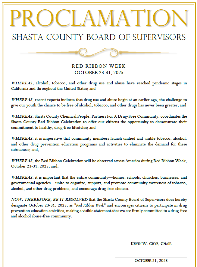 Locally, prevention partners led by Shasta County Chemical People,a youth and adult-led nonprofit focused on alcohol, tobacco, and other drug prevention, use the week to spotlight education and family engagement.