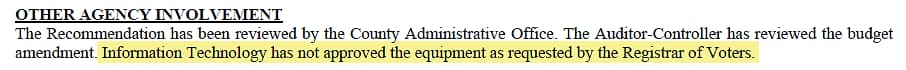 The current proposal seeks approval to buy specific items and services, including wireless security cameras, laptops, and other office hardware from Amazon, which is intended to modernize election operations per Registrar of Voter's Clint Curtis's vision. According to the staff report, the purchases are framed as necessary to improve transparency and efficiency. However, county IT staff have not yet reviewed the equipment list, raising questions about whether the proposed systems would function well for it's intended purpose.