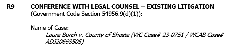 The Board will meet in closed session with legal counsel to discuss a Workers’ Compensation Case for Laura Burch who most recently served as Director of the Health and Human Services Agency until she went on medical leave in September 2024. She formally announced her retirement earlier this year.