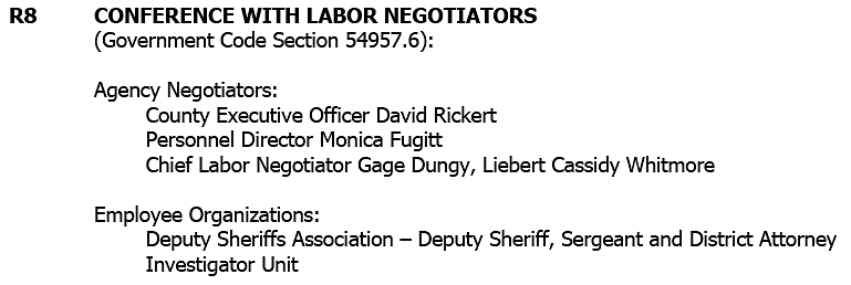 The Board will enter closed session to discuss labor negotiations with County representatives and legal counsel. The bargaining units involved are the Deputy Sheriffs Association, which represents deputies, sergeants, and District Attorney investigators.