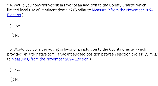 Despite that unresolved status, the survey has returned on the consent calendar with no scheduled board discussion. Notably, two of the questions reference Measure P and Measure Q, charter amendments that voters rejected in the November 2024 election. Measure P, concerning eminent domain, failed narrowly by 358 votes, while Measure Q, dealing with how vacancies are filled for elected offices, was rejected by more than 13,600 votes. Including these topics in a new survey raises questions about why the Board would solicit input on issues the electorate has already decided.