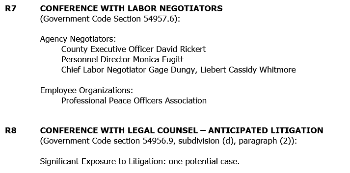 The Board will enter closed session with its labor negotiators to discuss terms with the Professional Peace Officers Association. These confidential talks typically cover compensation, benefits, and working conditions for deputies and investigators. Outcomes can have significant budget implications since public safety contracts represent some of the county’s largest recurring expenses.