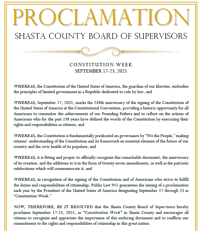 The Board will adopt a proclamation designating September 17–23, 2025, as “Constitution Week” in Shasta County. Sponsored by Supervisor Chris Kelstrom, the observance aligns with the national commemoration of the signing of the U.S. Constitution in 1787.
