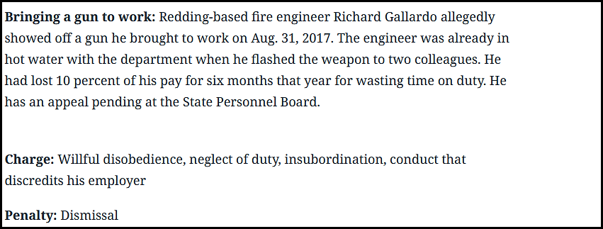 Gallardo was reportedly fired from his job at Cal Fire for brandishing a firearm at work. This deeply concerning act is a perfect example of his history of unsafe and unprofessional behavior in high-stakes environments.