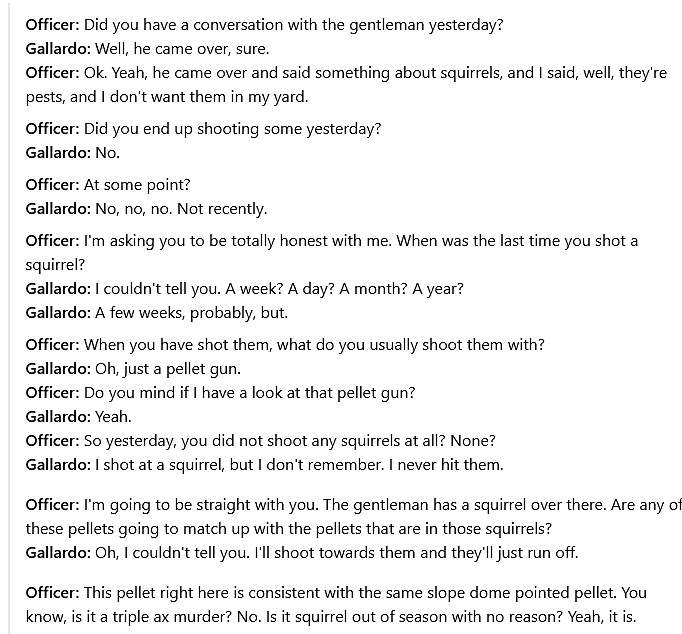 Footage from an Animal Planet show captured Gallardo lying to law enforcement about shooting squirrels in a residential area: