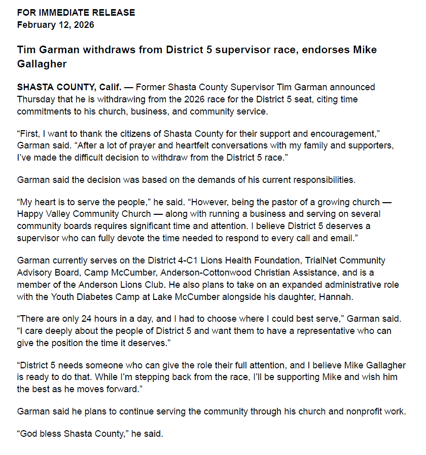 REDDING, Calif. — Former Shasta County Supervisor Tim Garman has withdrawn from the June 2026 District 5 supervisor race, ending a bid to unseat incumbent Chris Kelstrom and capping a political career defined by a dramatic ideological evolution on one of Northern California's most polarized governing bodies.
