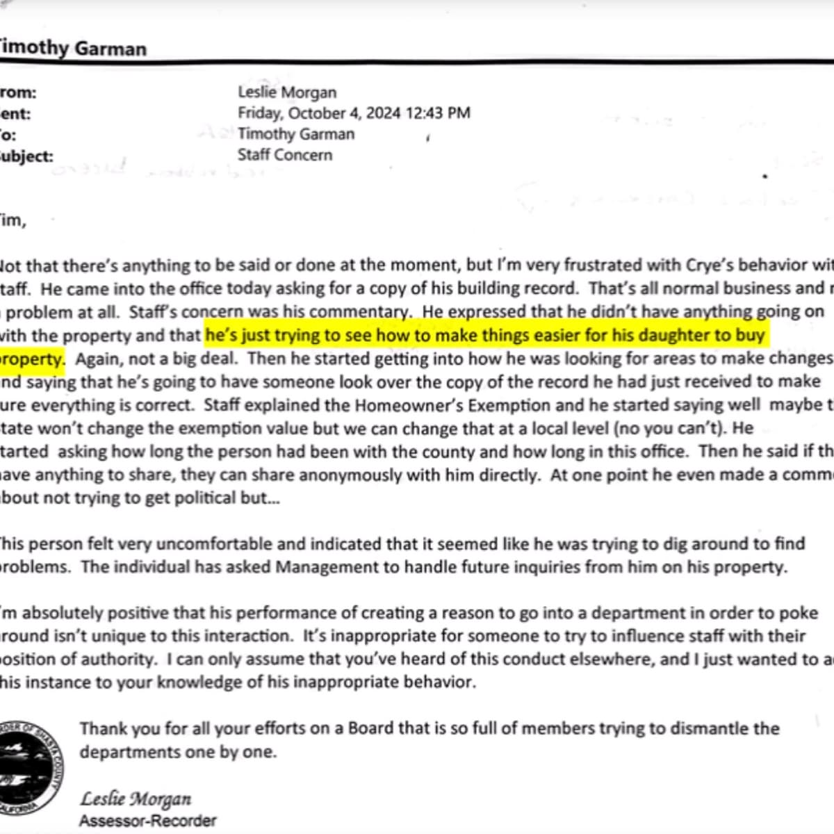 Morgan’s office has drawn attention in recent years during a dispute with Supervisor Kevin Crye. In October 2024, Morgan described Crye’s visit to the assessor-recorder’s office on personal business as concerning.
