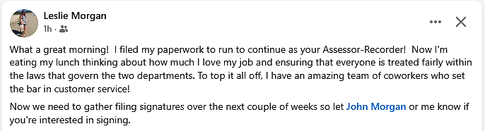 “What a great morning! I filed my paperwork to run to continue as your Assessor-Recorder!” Morgan wrote in the post.