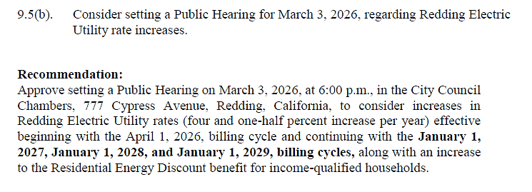 Perhaps the item with the broadest impact on Redding residents: Staff is asking the council to schedule a March 3 public hearing on proposed Redding Electric Utility rate increases of 4.5 percent per year beginning with the April 2026 billing cycle and continuing through January 2029.