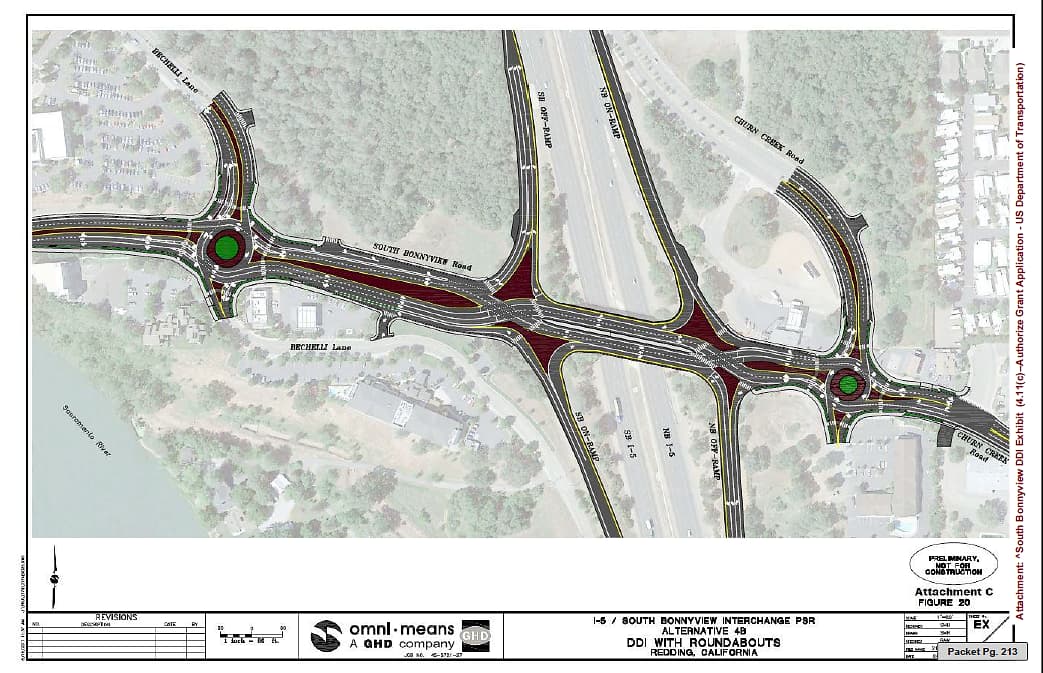 The project, which would reconfigure the Interstate 5 interchange at South Bonnyview Road, has been a long-running city priority. Staff have applied for federal funding under various program names over the past four years without success. The project would include a diverging diamond interchange — potentially the first in California bracketed by roundabouts on both ends — along with ramp improvements and a roundabout at South Bonnyview Road and Churn Creek Road.