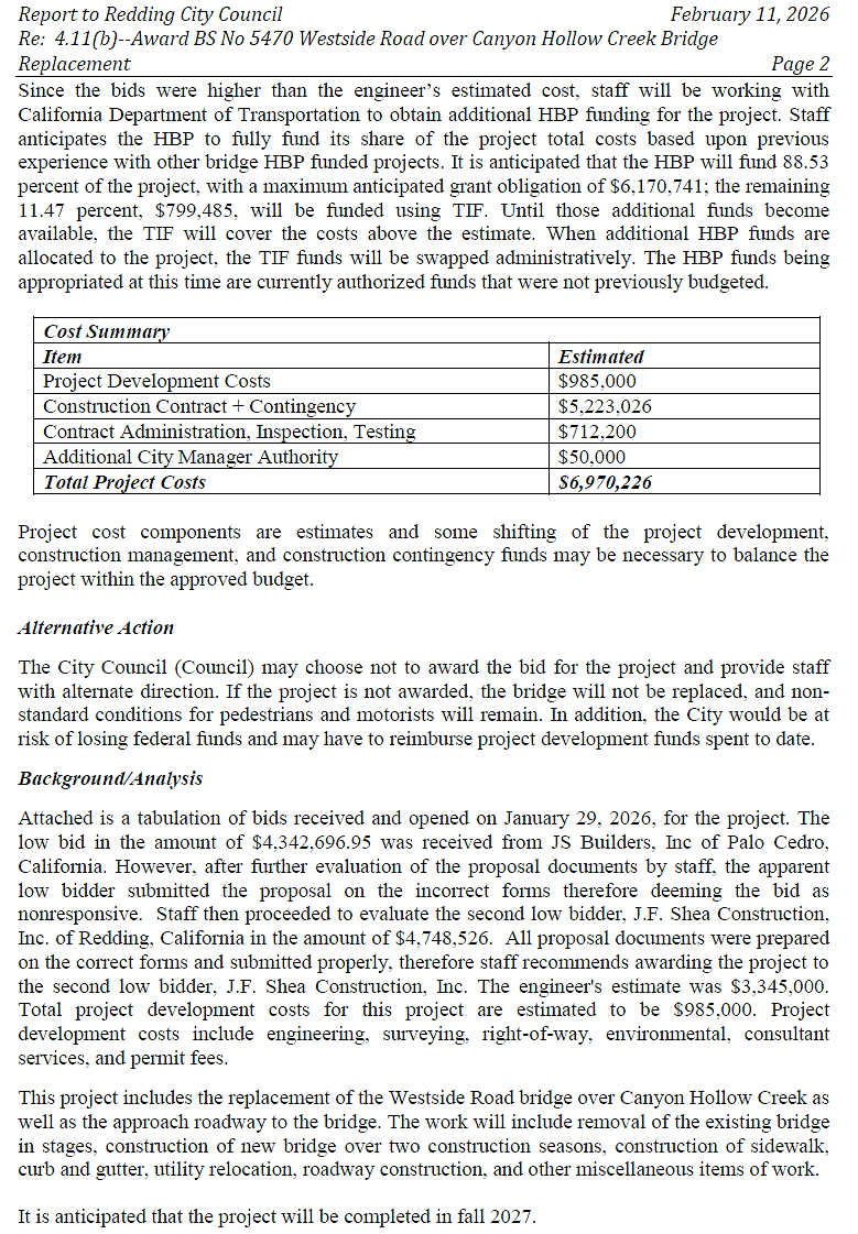The Westside Road over Canyon Hollow Creek Bridge replacement carries total estimated costs of nearly $7 million. Staff is recommending the council reject the apparent low bid from JS Builders Inc. of Palo Cedro as nonresponsive — the company submitted its proposal on incorrect forms — and instead award the contract to the second-lowest bidder, J.F. Shea Construction Inc. of Redding, at $4,748,526. That figure exceeds the engineer's estimate of $3,345,000.