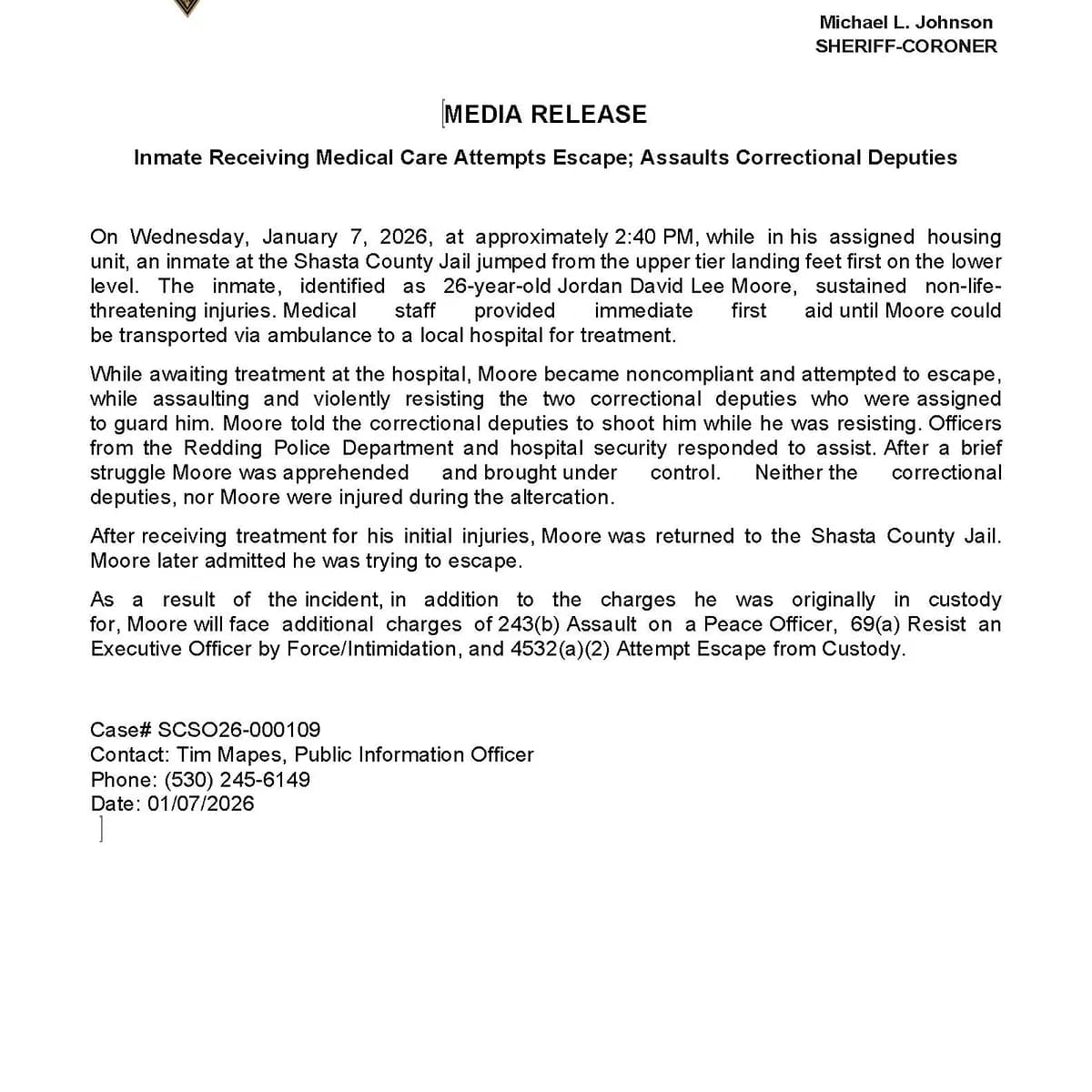 After receiving treatment for his initial injuries, Moore was returned to the Shasta County Jail. The sheriff’s office said Moore later admitted he was trying to escape.