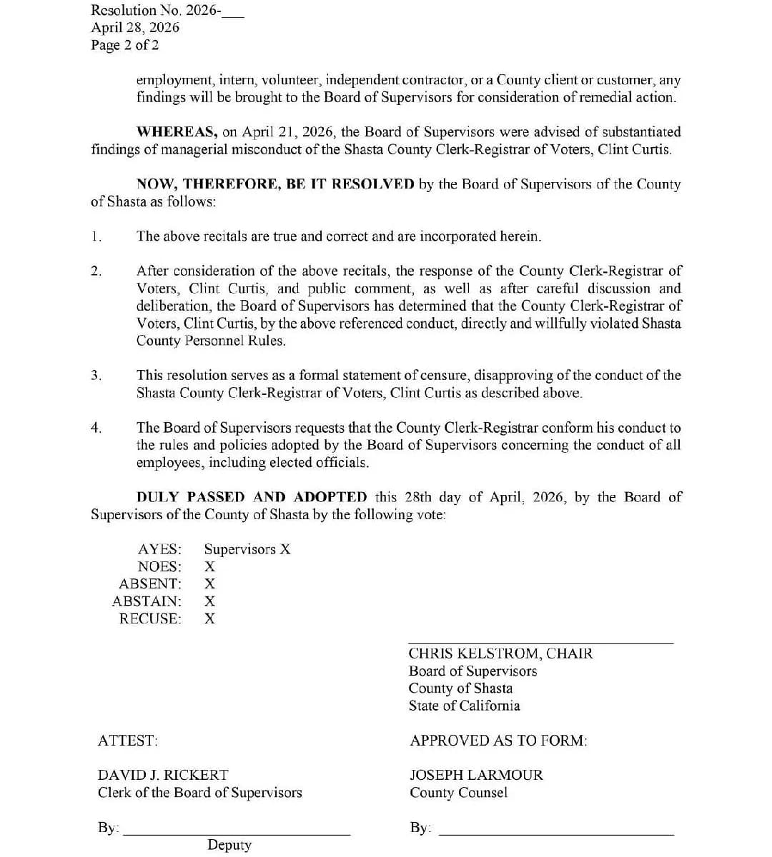 The board could adopt the censure resolution, decline it, revise it, or defer consideration. A censure is a formal expression of disapproval but carries no removal authority — Curtis is an appointed official whose term is set by county policy. The meeting will be livestreamed on Shasta County's website https://www.shastacounty.gov/board-supervisors/page/board-agendas-minutes-videos. As well as the North State Breakdown Facebook page.