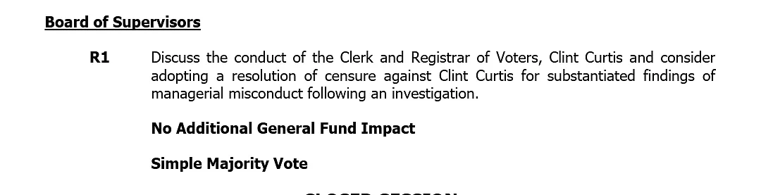 "Discuss the conduct of the Clerk and Registrar of Voters, Clint Curtis and consider adopting a resolution of censure against Clint Curtis for substantiated findings of managerial misconduct following an investigation."