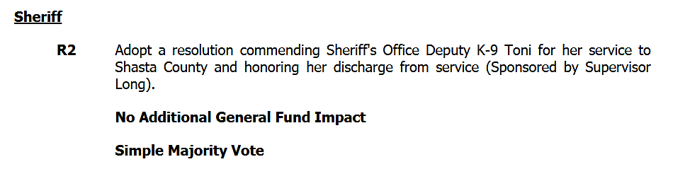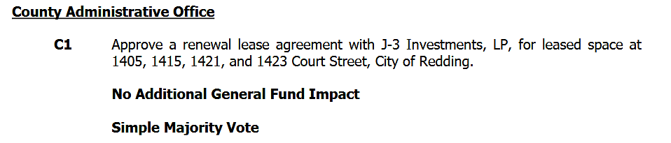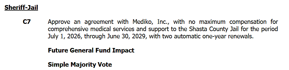The single largest financial item on Tuesday's agenda — listed on the consent calendar — is a three-year agreement with Mediko, Inc. for comprehensive medical services at the Shasta County Jail.