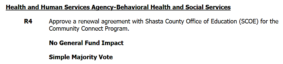 The board will consider renewing an agreement with the Shasta County Office of Education for the Community Connect Non-Crisis Support Program, a behavioral health initiative for K-12 students across all 26 county school districts.