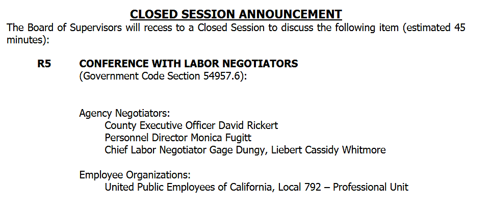 On labor negotiations, supervisors will meet with CEO David Rickert, Personnel Director Monica Fugitt and outside labor counsel Gage Dungy of Liebert Cassidy Whitmore for continued bargaining with United Public Employees of California Local 792.