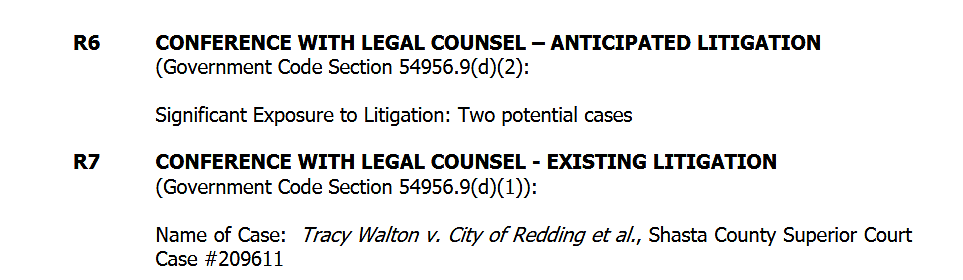 On existing litigation, the board will discuss Tracy Walton v. City of Redding et al., Shasta County Superior Court Case No. 209611.