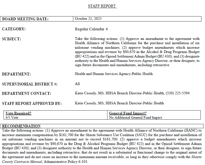 The Shasta County Board of Supervisors meets Tuesday, October 21, 2025, at 9:00 a.m. This agenda features an HHSA finances update with a short-term General Fund loan extension and realignment transfer, a proposed pilot to install two 24/7 naloxone (Narcan) vending machines, and a road-easement vacation hearing in Cottonwood.