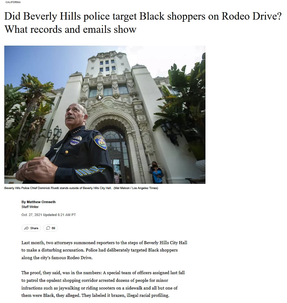 According to a 2021 investigative article, Nance was a key supervisor in the Beverly Hills Police Department’s “Rodeo Drive Team,” a specialized enforcement unit launched in the summer of 2020. During a two-month period, the unit made 90 arrests. Of those arrested, 80 were Black. Only 10 of the cases were prosecuted.